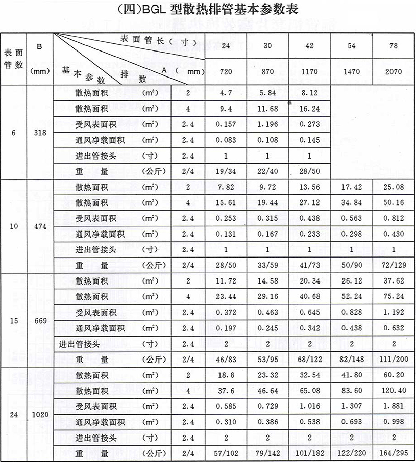 BGL型不銹鋼散熱排管,可分二排、四排、六排,當(dāng)然也能制單排,以及其他非標(biāo)形式,每種型號均有大小不同的規(guī)格,在此只標(biāo)常規(guī)型號、規(guī)格。其中外殼、無縫不銹鋼管¢18×2m/m均用1Cr18Ni9Ti材料,其翅片管用鋁軋制而成,翅片管外徑為¢38mm,根徑為¢19mm,其片高為9.5mm,片距為R片(3m/m),翅片管呈螺旋狀。